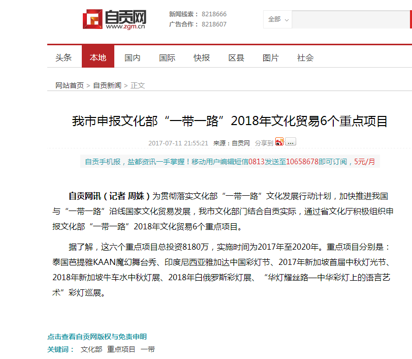 為落實“一帶一路”國家戰(zhàn)略,呼應(yīng)國家、省、市“一帶一路”重大倡議目標(biāo),我公司以“絲路之燈東方來”為主線積極拓展境外市場。目前公司新加坡、俄羅斯兩個燈展項目,被自貢文化部門推薦入錄國家文化部“一帶一路”2018年文化貿(mào)易重點項目申報庫。自貢市上報的文化貿(mào)易重點項目共計6個。