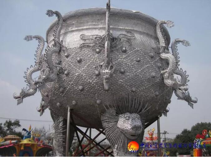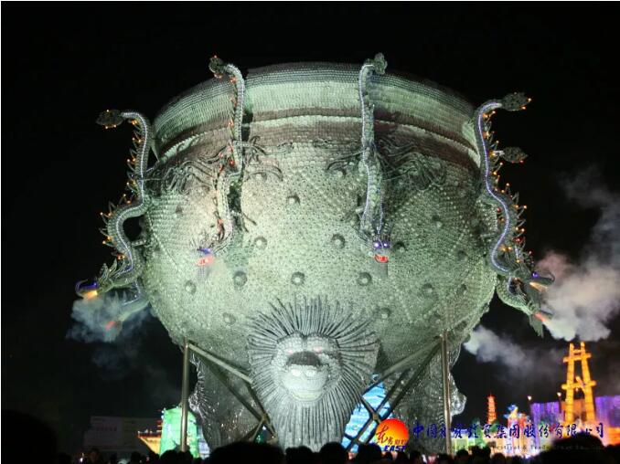 東方彩燈精心設(shè)計(jì)制作的“九龍鼎”燈組采用景德鎮(zhèn)青花玲瓏瓷具杯、羹、匙、盅、盤、碟、碗等近30萬件手工捆扎而成,主體為鋼結(jié)構(gòu);鼎高和直徑均為18米,最大處直徑26米,總重近100噸。