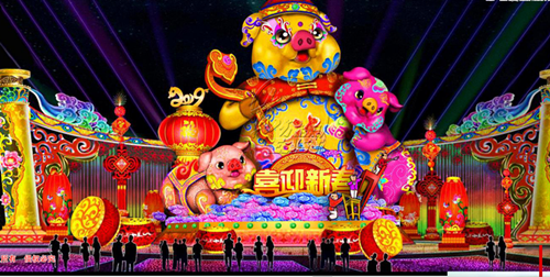本屆太陽節(jié)以《太陽崇拜》、《玉米門神》等瑪雅諸神燈組,以及《夢幻森林》、《動物世界》里與瑪雅人息息相關的動物燈組,與《古蜀文明》、《古蜀生活》中古蜀人漁獵農耕和祭祀相關的燈組交相輝映。園區(qū)氛圍營造也極具特色,瑪雅象形文字、古蜀紋飾等元素將帶領觀眾進入兩大文明交匯的海洋。當然,應景的“年味兒”也必不可少,東方彩燈打造金沙節(jié)史上最大的立體生肖豬造型,向觀眾送上新年祝福。
