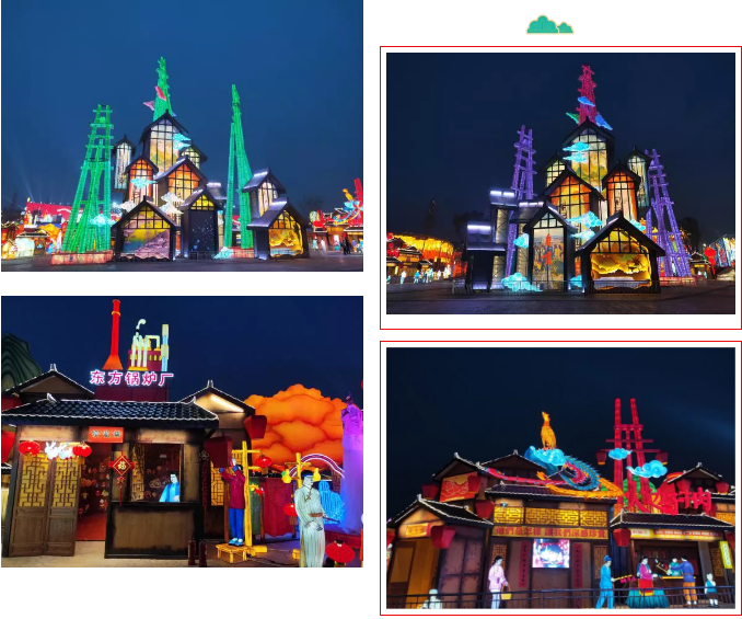 《自貢記憶》主燈組使用傳統(tǒng)材質(zhì)結(jié)合現(xiàn)代工藝,宏偉的天車獨(dú)創(chuàng)性的使用啤酒瓶制作,配合追光變色形成絢麗奪目的燈光效果。顯示屏剪影式表現(xiàn)自貢元素??铸埓┬小㈠\鯉游動,還有靈活靈現(xiàn)的自貢歷史場景和人物,還原了一幅原滋原味又生動的老自貢記憶。