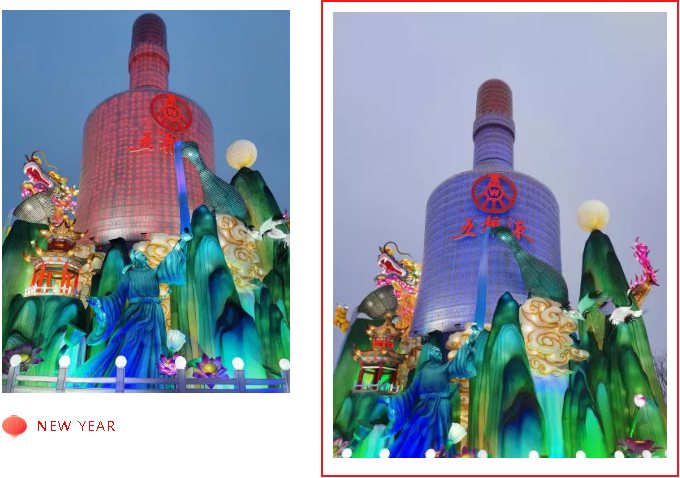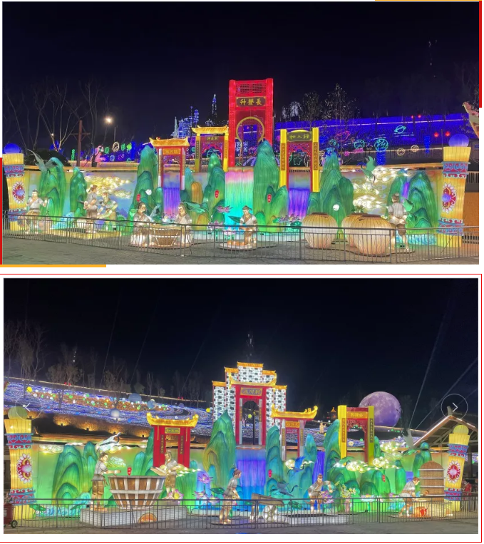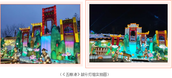 《五糧液》主燈組采用第八代五糧液酒瓶運(yùn)用自貢彩燈傳統(tǒng)工藝?yán)υ删扌臀寮Z液,輔以仙山、仙境、巨龍騰越氛圍闡釋五糧傳奇,杯酒時光,百年味道。周邊群燈組展示封存在時光中的“活窖池”--利川永、張萬和、劉鼎興、天賜福、聽月樓、全恒昌等八家明代釀酒作坊,歷史悠久的古窖池群講述著傳承幾百年的五糧液釀酒工藝,折射幾千年氤氳酒香的中國酒歷史和酒文化。