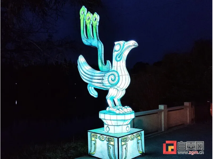 鳥(niǎo)與古蜀的關(guān)系十分密切,三星堆館藏文物中有眾多的鳳鳥(niǎo)形器物及紋飾圖案,在此次燈展中,也有不少以鳥(niǎo)為元素進(jìn)行設(shè)計(jì)。其中一組以青銅鳳鳥(niǎo)為設(shè)計(jì)原型的燈組,兩只相似但不相同的高2.8米的鳳鳥(niǎo)燈組立于入口兩側(cè)通道處。