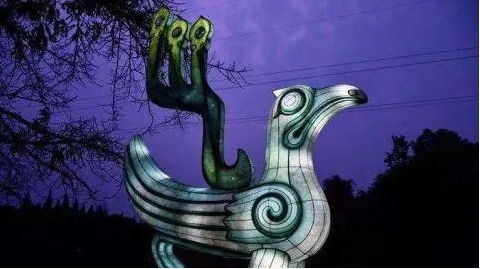 入口兩側(cè)(橋外側(cè))處,設(shè)置了兩只相似但不相同的鳳鳥燈組立于入口兩側(cè)通道處,高2.8米。以青銅鳳鳥為設(shè)計原型,鳥與蜀族之關(guān)系極為密切,三星堆館藏文物中有眾多的鳳鳥形器物及紋飾圖案。
